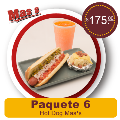 ¡Descubre nuestra combinación! Para Mass sabor, no te pierdas de nuestro hot dog especial junto con unas papas al carbón. Con agua 100% de sabor natural o un refresco especial. Es el momento de elegir tu plan de comida.